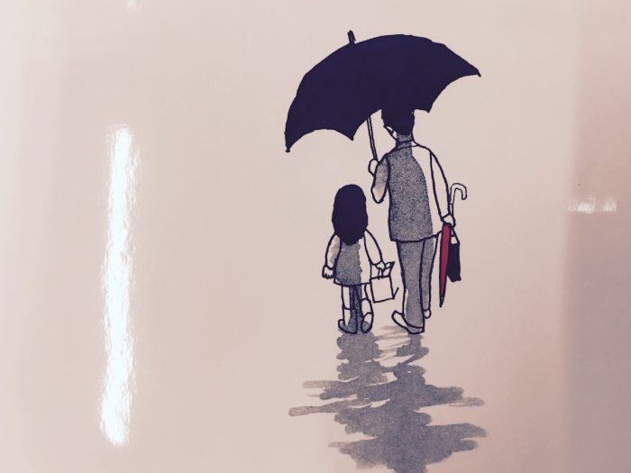 お父さんの黒く長い傘を大切に持ち、駅までの街並みを歩く女の子の姿。