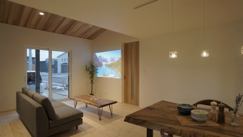 富士市のリビングディーガーデン富士見台に完成した新しいモデルハウスKIBACO 05 noki リビングは間接照明とペンダントライト、スタンドライトダイニングキッチンは天井埋込配線ダクト+小径スポットライトダウンライトが無い、スッキリと綺麗な天井空間です。 空間全体を明るくするのではなく、必要な場所ごとに適度な灯りを鏤める。 ゆったりと安らぐ大人な灯り。是非モデルハウスでご体感ください。デザイン設計室 實石