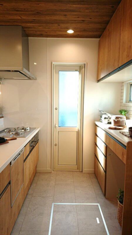 キッチン部分の天井木目&床をグレーのタイル調にし