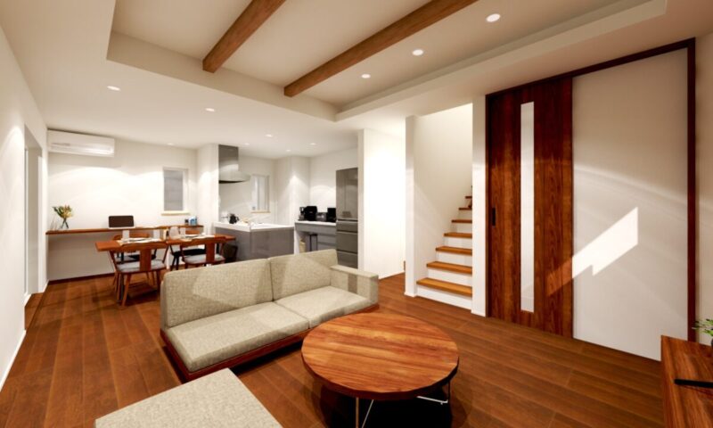 ▪ 折上げ天井+化粧梁で開放的なリビング。