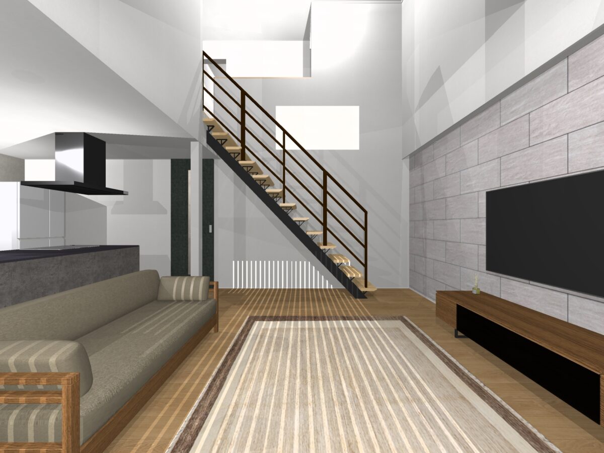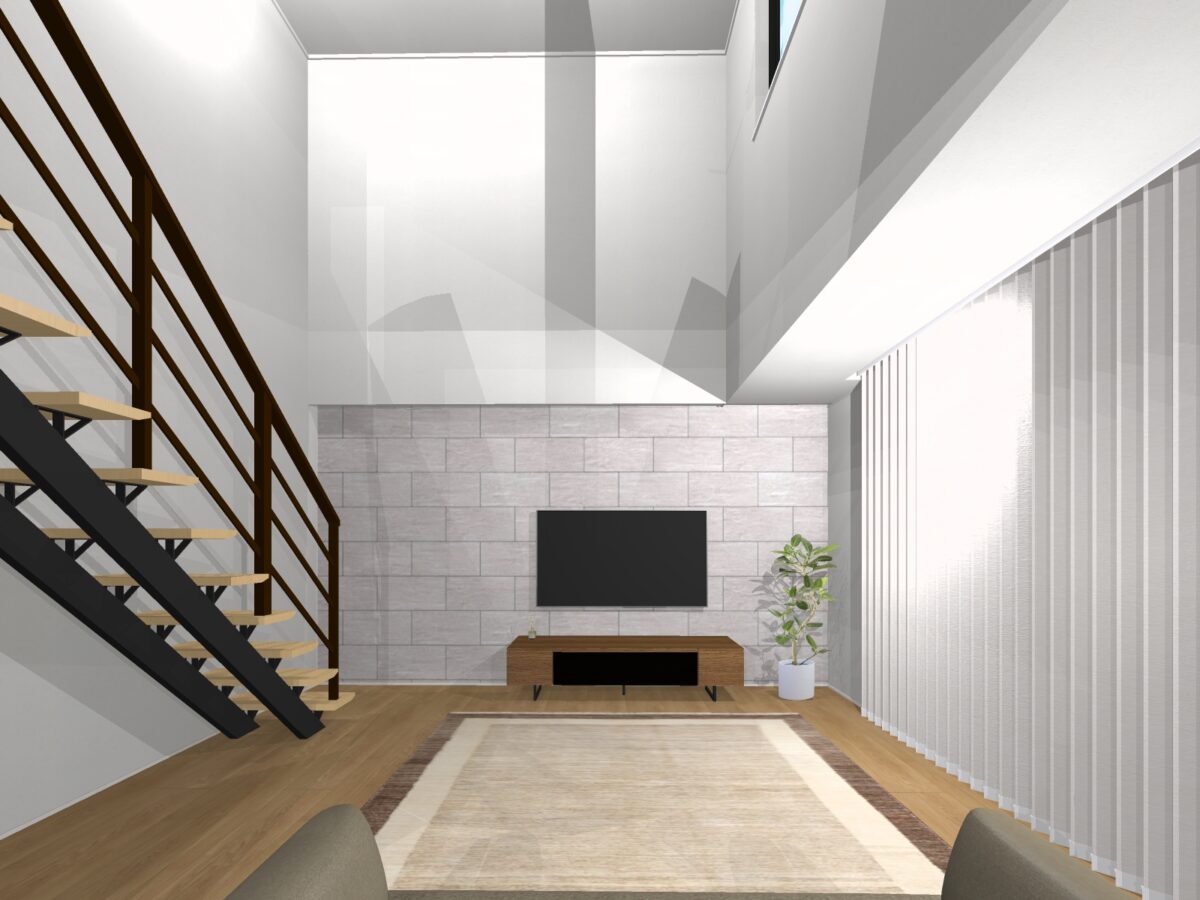 リビングは大きな吹き抜けから光が降り注ぐ、明るく開放的な空間。天井まで続く大きな窓が、より広がりを感じさせてくれます。テレビ背面には、上品なグレーのタイルを貼り、空間のアクセントに。タイルをやわらかく照らす間接照明が、落ち着いた雰囲気を演出してくれます。