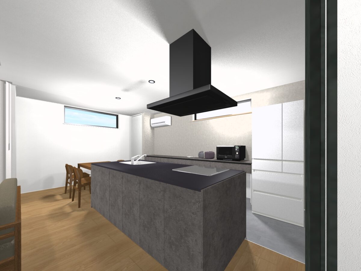 グレーブラックでまとめた重厚感のあるキッチンまわり。