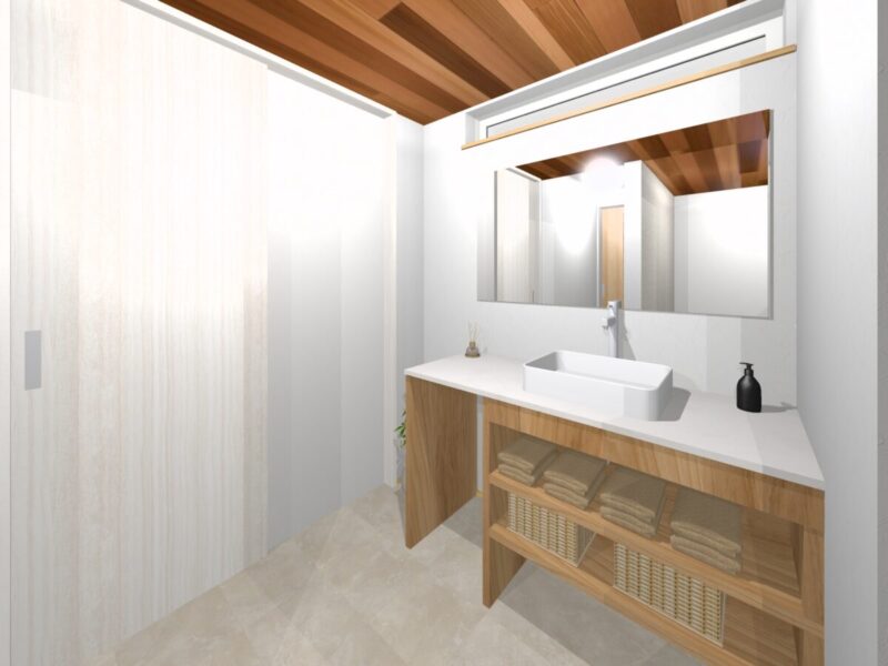 来客時やメイク時にも使いやすい、機能的な造作洗面。