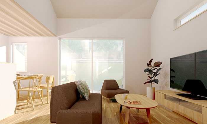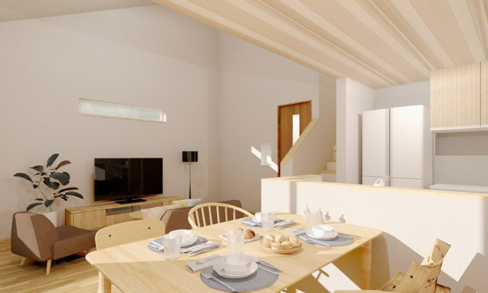 勾配天井がつくる、縦に広がる開放的なリビング。