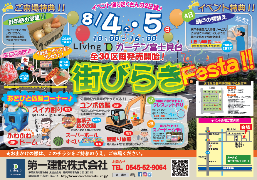 今週末、8/4(土)・5(日)はLiving D ガーデン富士見台分譲地の街びらきFESTAを開催します!!全30区画の大きな分譲地です。この機会にぜひ、イベントを楽しみながら近隣の様子など、場所をお確かめください!イベントでは、なんとたったの50円で「駄菓子詰め放題!!」を両日ともに開催します!※写真はイメージです。お子様が喜ぶこと間違いなしですね!ぜひ、たくさん詰めておやつをGETしてください!!その他の詳細情報はコチラから!街びらきFESTAスタッフブログもどうぞ。Living Dガーデン富士見台分譲地についての詳細はコチラまで。企画広報 山田 祐子