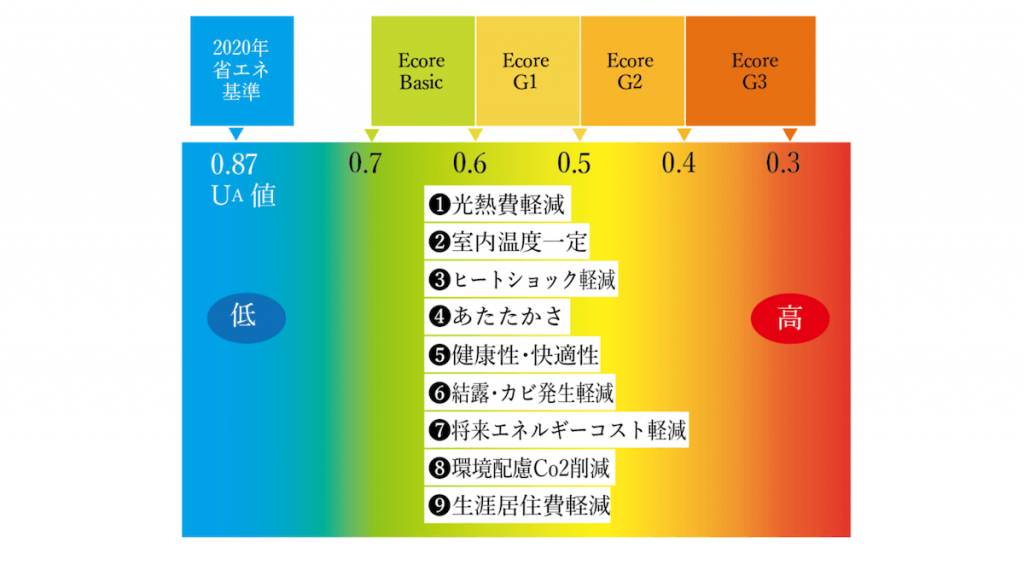 ※ECORE_エコレは、第一建設オリジナルデザイン設計住宅『HIBIKI』『KIBACO』の断熱性能グレード名称。