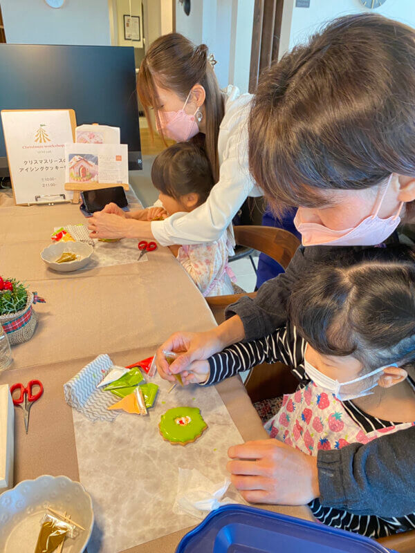 会場1Fでは、クリスマスリースのアイシングクッキー作りを。