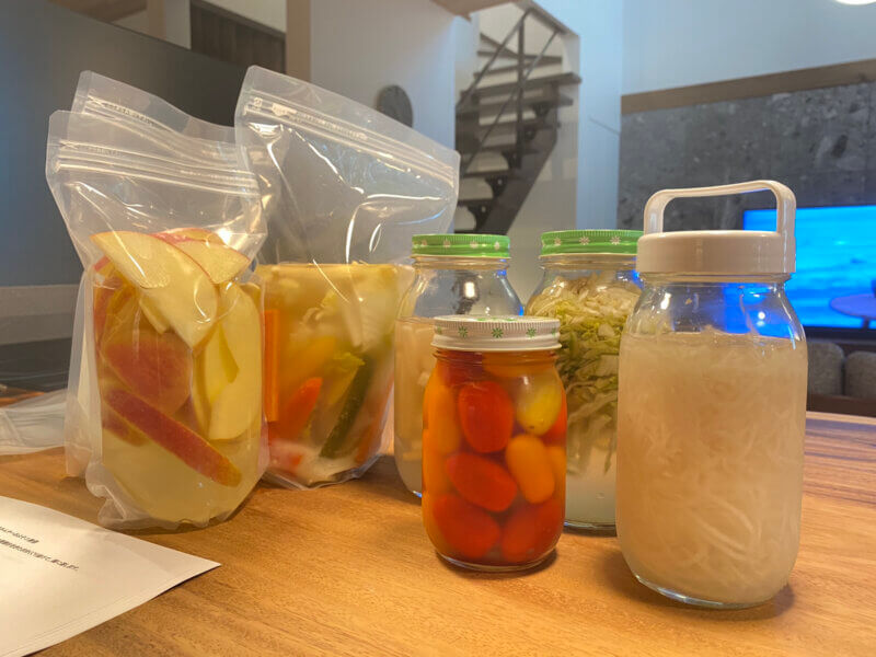 パウチの中に野菜と汁を入れ発酵していきます。