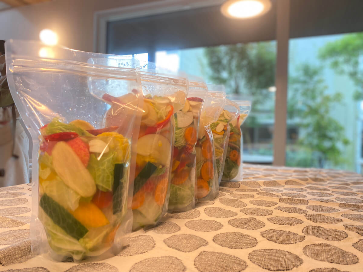 パウチの中に野菜と汁を入れ発酵していきます。