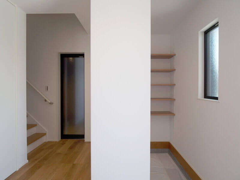 ▼玄関からは土間収納・ガレージ・2階へ行く動線と