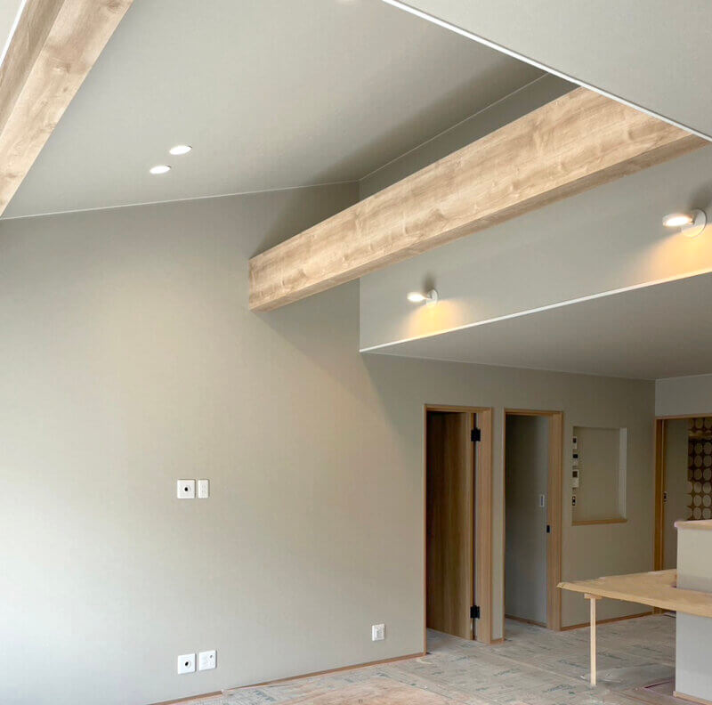 勾配天井+梁のある開放的で落ち着きのあるLDK。