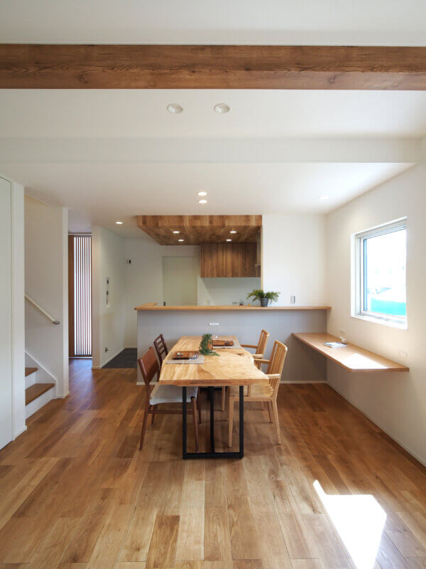 リビングには折り上げ天井+梁、キッチンには下がり天井で空間アクセントを。
