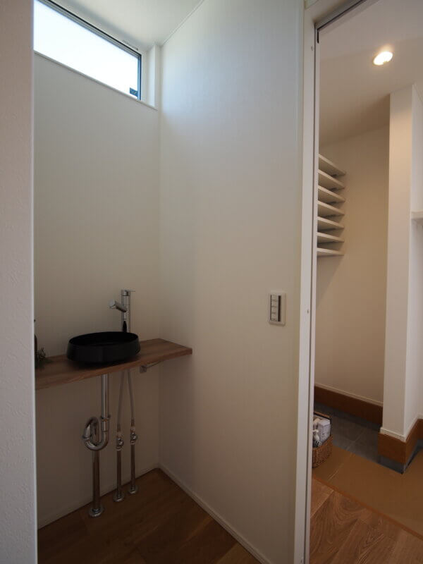 土間収納横にはコンパクトな手洗いを。来客時も帰宅後も清潔を保てますね。