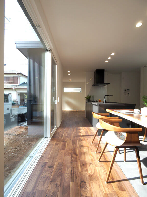ダイニング・キッチン前の大きなトリプルガラス樹脂窓。