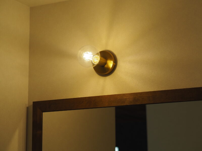 木調キャビネット、シンプルな照明、木製フレームのミラーに