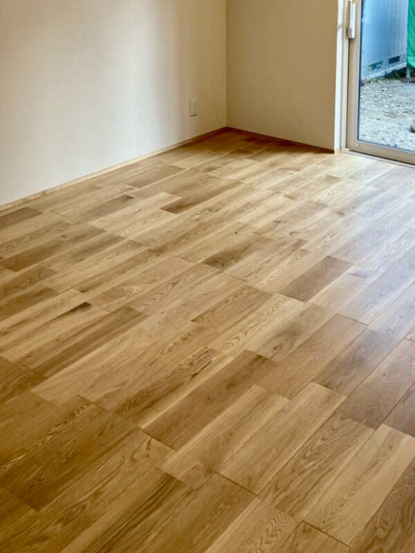 室内は、無垢オーク床材のぬくもりが広がるLDK空間。
