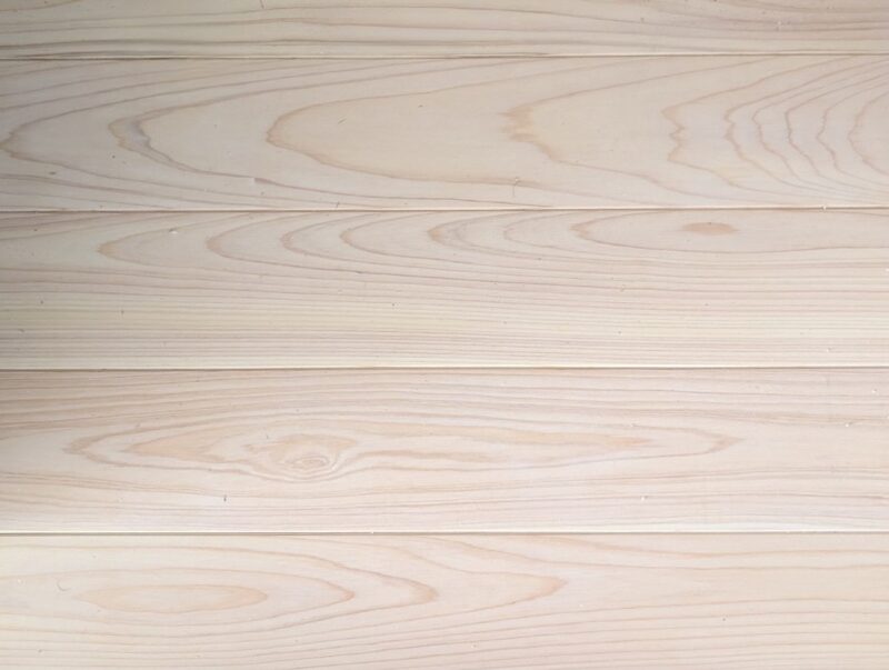 床材は、無垢のヒノキにホワイトの柿渋塗装を施し、