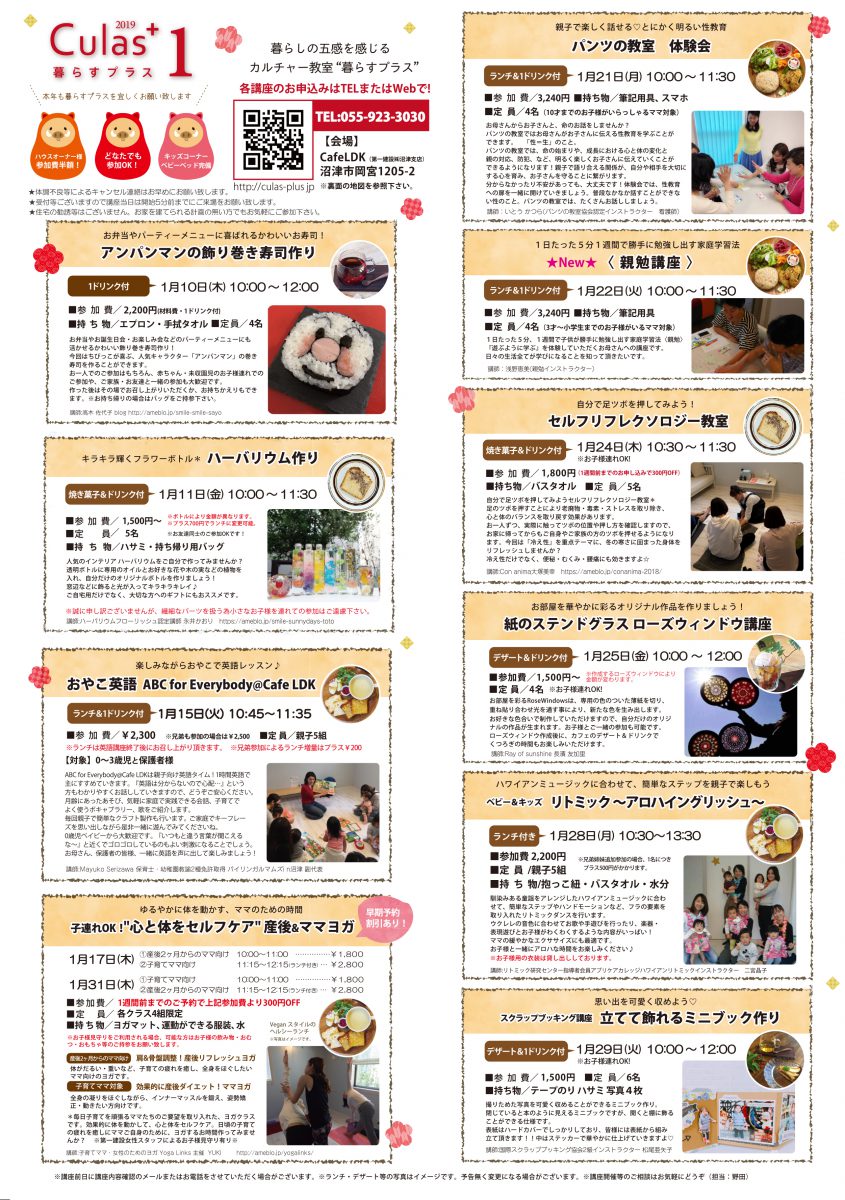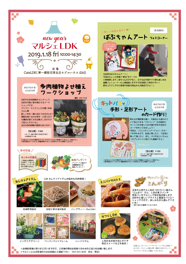 *あけましておめでとうございます*本年もカルチャー教室“暮らすプラス(沼津)”を宜しくお願い致します。新しい1年に、新たな気落ちで自分の可能性を広げてみませんか?2019年1月から新講座「親勉講座」もはじまります! また、1月以降も新講座がぞくぞくと登場予定ですのでお楽しみに♪暮らすプラスの詳細はこちらから確認できます→★ ◎1月18日(金)はマルシェLDK開催日です。こちらもお楽しみに!