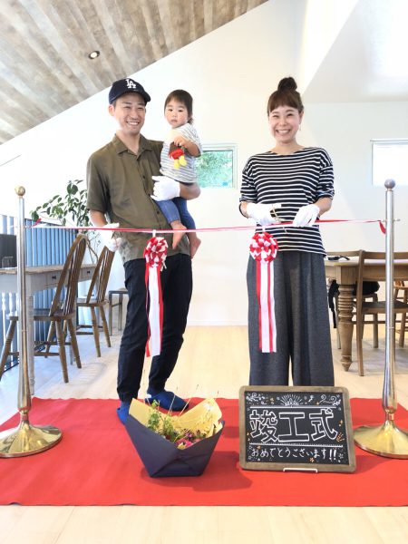 Y様本日は竣工式 誠におめでとうございます! 本日のお喜びを一言お願い致します。「本日は ステキな竣工式をしていただき、ありがとうございました。無事にこの日を迎えられてとても嬉しく思います。皆様のおかげで楽しく家づくりができました。本当にありがとうございました。これからもよろしくお願いします。とってもステキなお家です!