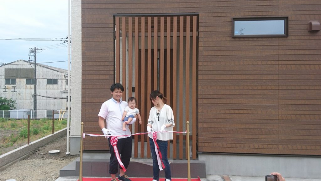 本日は、竣工式おめでとうございます。今日の日のお喜びをお客様より一言お願い致します。 『本日はありがとうございました。この日を迎えることができ、とても嬉しく思います。 これも、私たちのワガママを聞いてくれたり、色々な相談に乗っていただいたりと、 第一建設さんをはじめ、たくさんの方にご協力していただいたおかげです。 これから、この素敵な家で家族の思い出をたくさん築いていきたいと思います! 本当にありがとうございました! いつでも遊びに来てください!笑』 ※メッセージと写真は、お客様よりご了承頂いたものを掲載しております