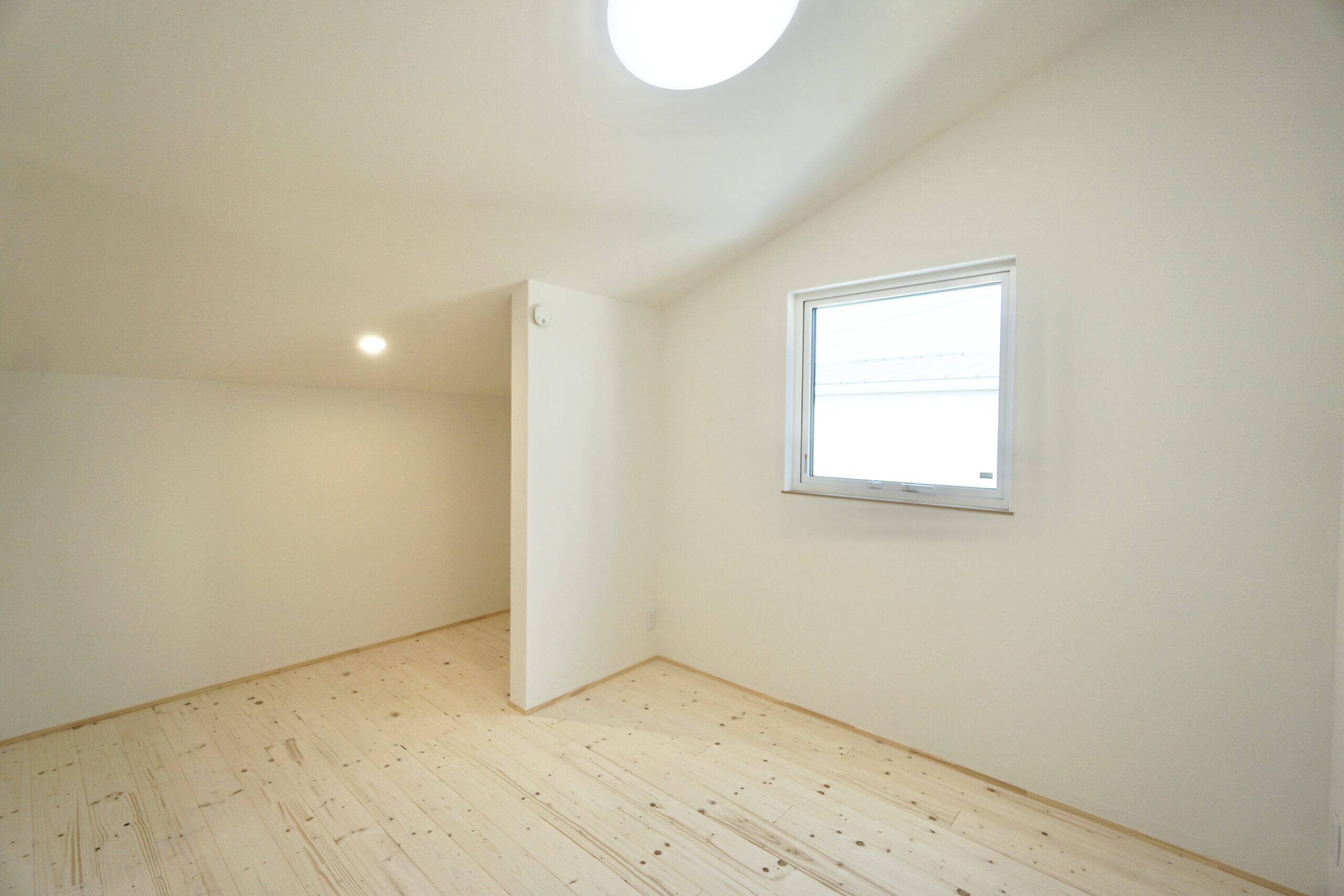 屋根勾配を活かした空間の広がと無垢床の相乗効果委でコンパクトながらにリラックスできる洋室。