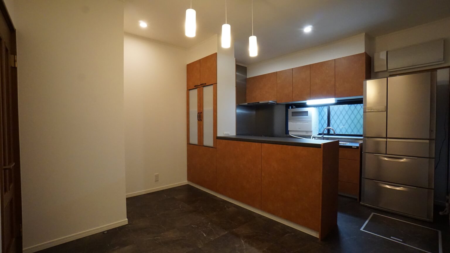 キャメル色のレザー調のキッチン扉。