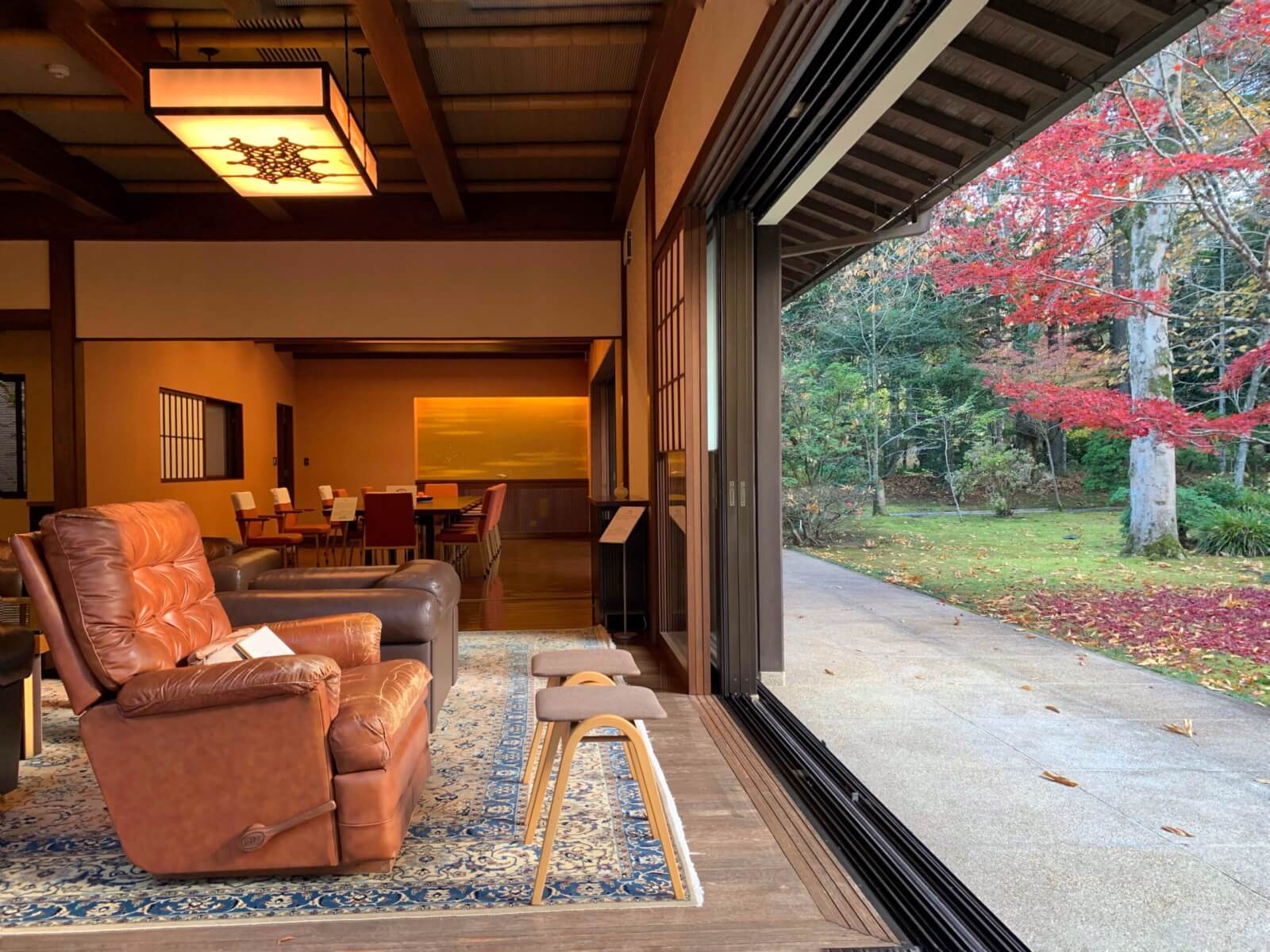 手前のキャメル色のソファーから眺めるお庭は絶景です。