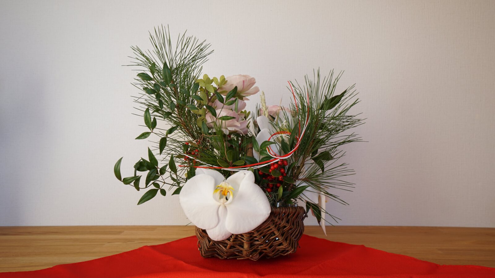 松、ラナンキュラス、胡蝶蘭、柊、稲、