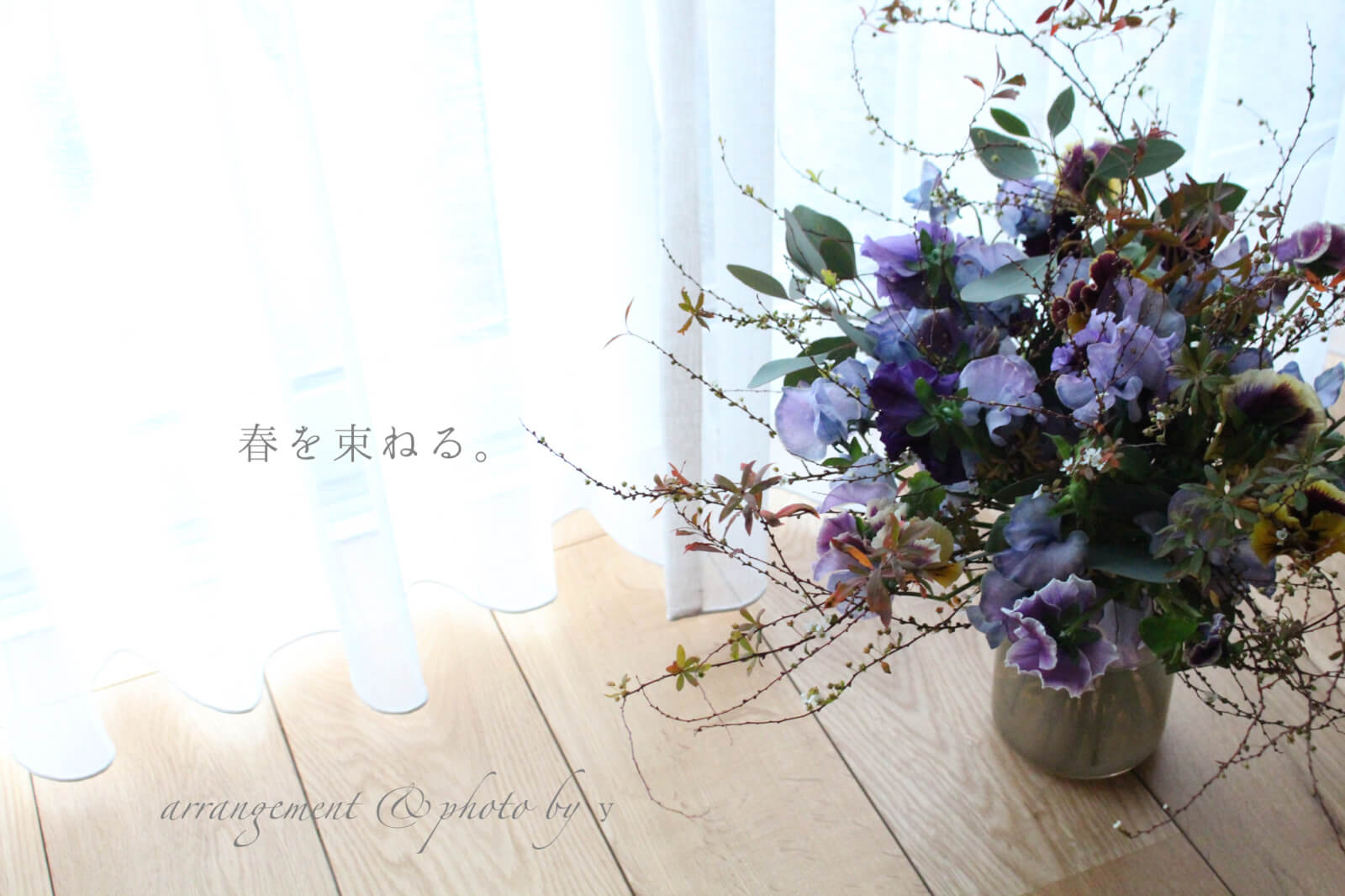 おはようございます。山本です。 もうすぐ春。 春のお花を束ねました。 パンジー染のスイートピー シャロン アッシュブルー2023雪柳ユーカリ 雪柳は紅葉して芽吹いている感じ。まだまだ空気が冷たい季節、春のお花とも合わせられて、春と冬を表現できるようにと先生が選んでくださったもの。 染めのスイートピーは無農薬の染めなのだそう。花先から花の根元にかけて、微妙な色合いの差があり素敵です。 まだまだ寒さが厳しいとき。光りの加減を調節して、スモーキーな雰囲気の写真にしてみました。 先日、春の球根寄せ植えキッドをネット注文しました。 昨年も同じものを販売していて、かわいいなと思っていたのです。また、そちらもご紹介します。 断熱リフォームのお家 施工事例 資料請求・問合せはこちら 2月のリノベ&建替えゼミ リフォーム・リノベーションで理想の暮らしを叶えてみませんか。リフォーム・リノベ施工事例はこちら >>>LIXILメンバーズコンテスト2021 新築部門 敢闘賞いただきましたLIXILメンバーズコンテスト2019 リフォーム部門 敢闘賞いただきました 2022年4月20日\ 第一建設は今年50周年を迎えました / 「新しいミライのカタチを創造しよう!」未来の社会と会社を見据え高付加価値の住まいとサービスを創造提供し持続循環するロングライフデザインのサステナブル企業としてお客様の幸せと快適な 暮らしに貢献します。コンセプトHIBIKIはこちら >>>