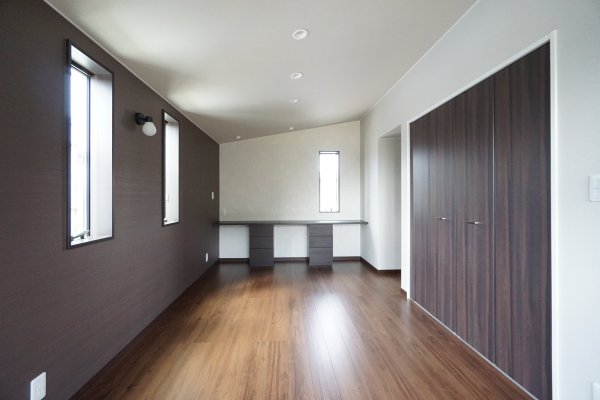 ベースのクロスも落ち着いた色目を選び壁付け照明が付いている面は、