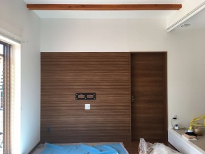 TVの背中の壁は、建具の木目に合わせたクロスをご提案し貼り替えました。