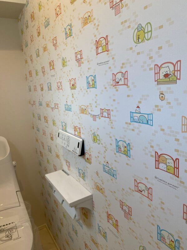 トイレの1面だけをアクセントクロスでデザインしていただきました。