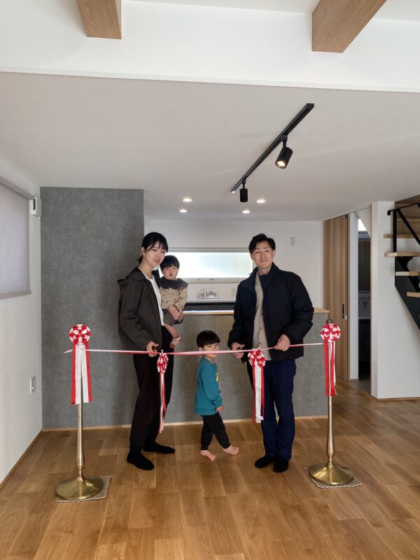 先日、お客様の念願のマイホームが完成しお引渡しを行いました。ご家族4人のお家です。恒例のテープカットも行いました!今回選んでいただいた建物は高性能でコスパが最高な規格住宅KIBACOシリーズです。内装も天然木の床材やシースルー階段も標準仕様で規格住宅と思えない装備になっています。お引渡しの際にお客様より「リビングディーを選んでよかった」とお言葉を頂きました!ありがとうございます!励みになります!今後とも末永くよろしくお願いいたします。KIBACOをもっと詳しくKIBACO実例見学会開催