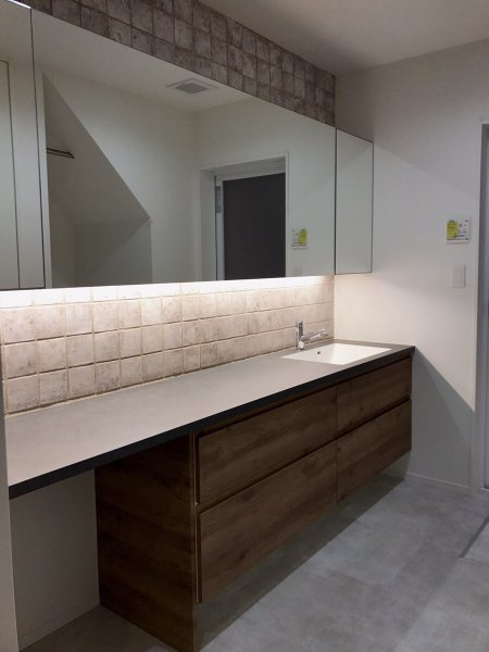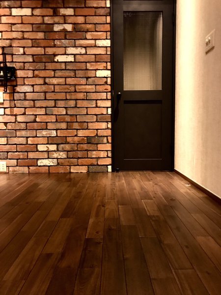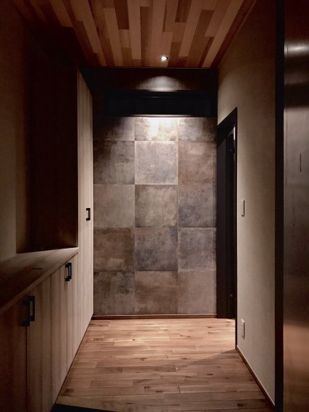 照明に照らされたレンガ調タイルがノスタルジックな佇まいです。