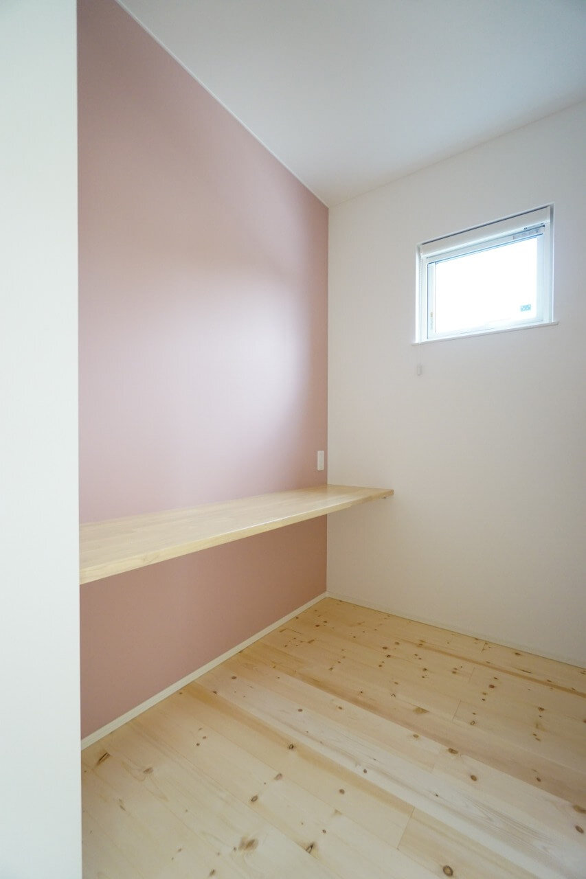 <明るい木目に優しい色味のピンク>