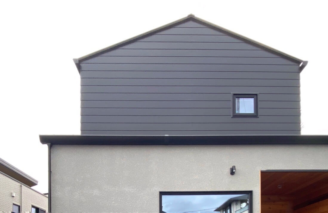 外観にはガルバと、木製パネリング、