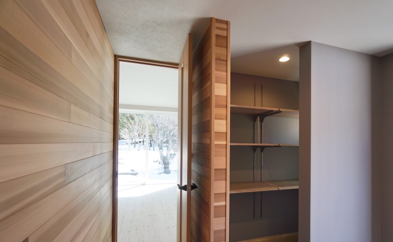 奥側のパントリーには、少し柄のあるブルーの壁紙を。