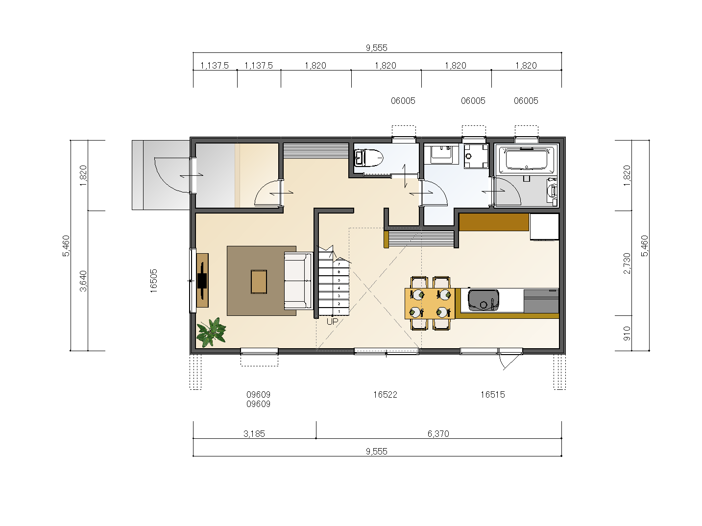 【樹BACO_01_E2】の見方ですが、01は外観の種類(キュービックデザイン)、EというのはEAST(東)または反転してWEST(西)に入口のある間取りということです。