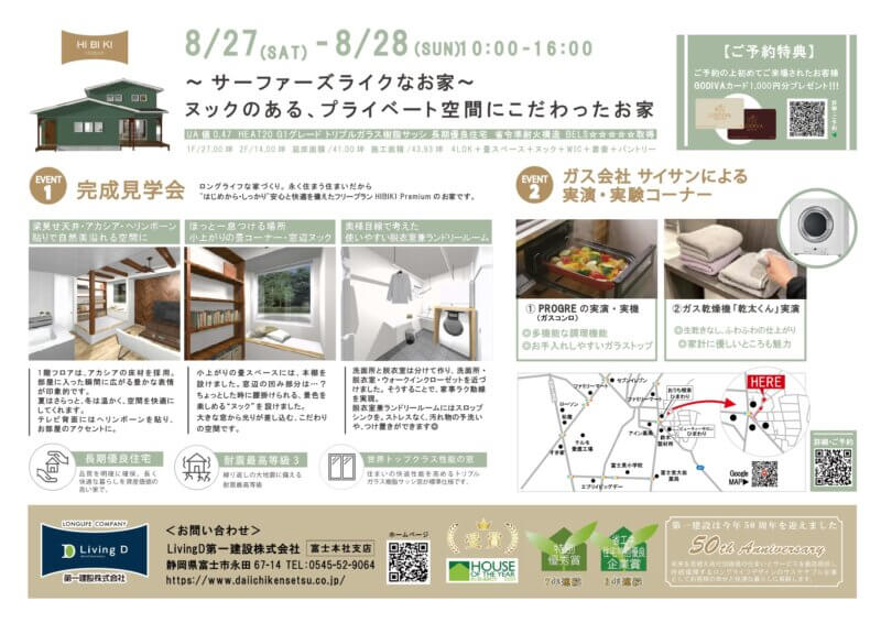 サーファーズライクなお家完成見学会、チラシが完成しました。富士宮市見学会