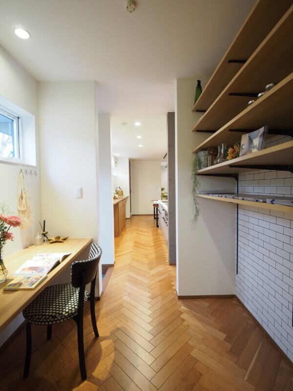 ◎ 冷蔵庫や家電などを収めて生活感を出さないキッチン周りに。