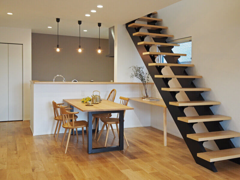 黒の色味が入ったオープン階段とペンダントライトが引き締め役になっています😊