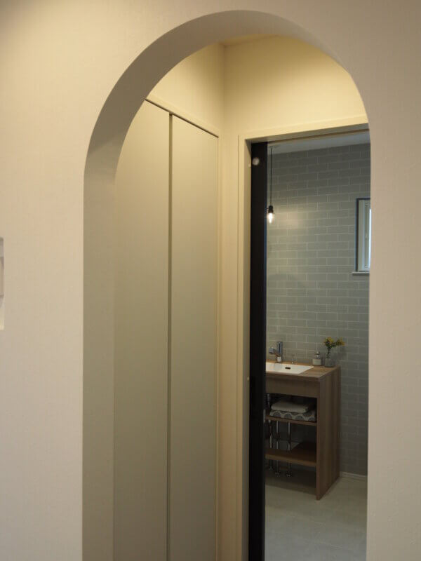 キッチンとサニタリールームを区切る素敵なアーチ壁😊