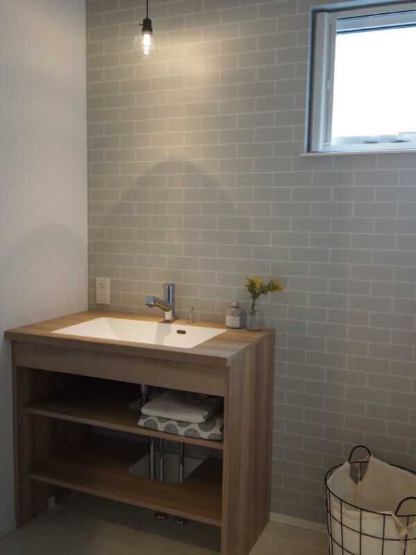 グレーのアクセントクロスに落ち着いた色味の洗面化粧台✨