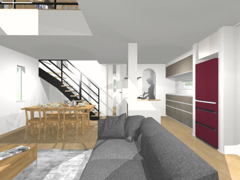 吹き抜けで1階と2階に繋げ、空間に繋がりを。
