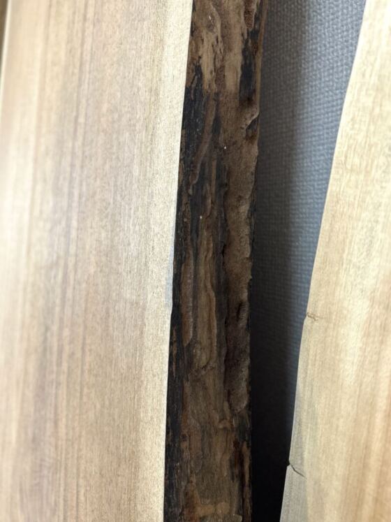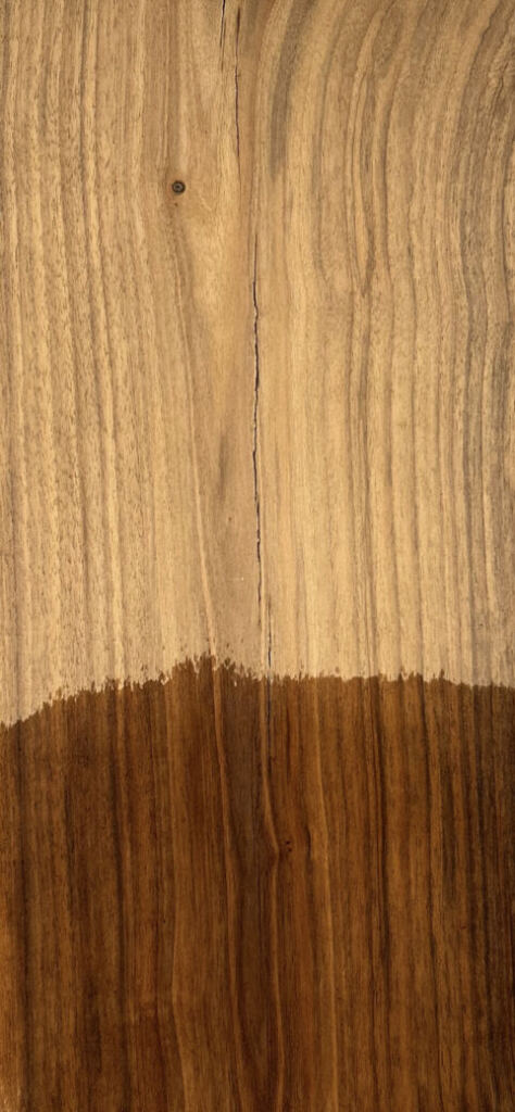 無塗装のブラックウォルナット一枚板は、水で濡らすことで塗装後の仕上がりイメージを確認することができます。