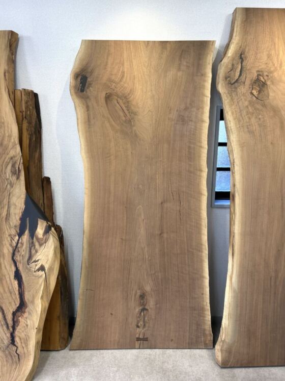 木目は比較的素直で整いながらも、ところどころに木が生きてきた証ともいえる節や表情の変化が現れており、均一ではない自然素材ならではの奥行きを感じさせます。中央付近に見られる縦に流れる木目は、天板として使用した際に空間に広がりと安定感をもたらしてくれるポイントです。
