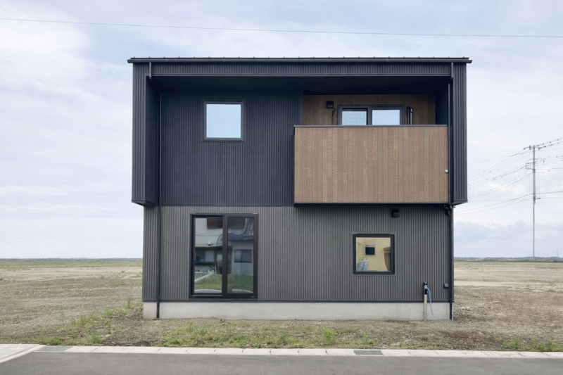 外観は、ブラック×いぶし銀のガルバリウム鋼板で仕上げた、
