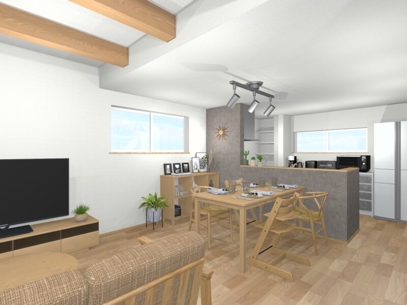 家族みんなが集まるLDKは、温かみのある木の空間に