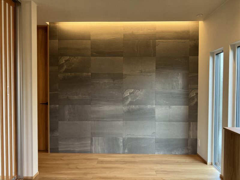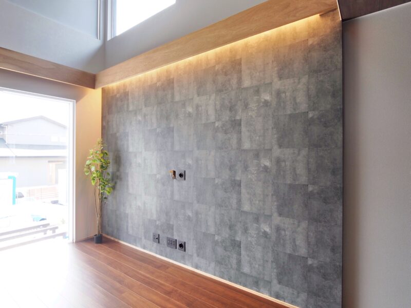 リビングでは、素材感のある壁面と