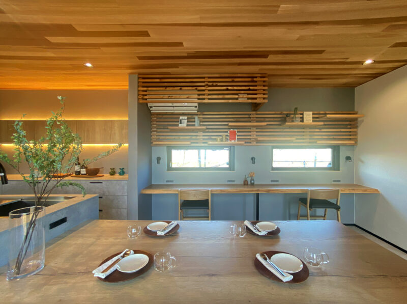 ダイニングは、木の天井とあたたかい光が調和し、